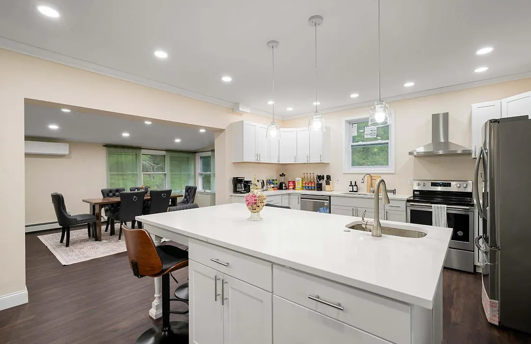 Family Oasis Pool Firepit Creek Near Delaware Villa provides an equipped kitchen with an electric kettle, a fridge, and kitchenware for guests' use.
